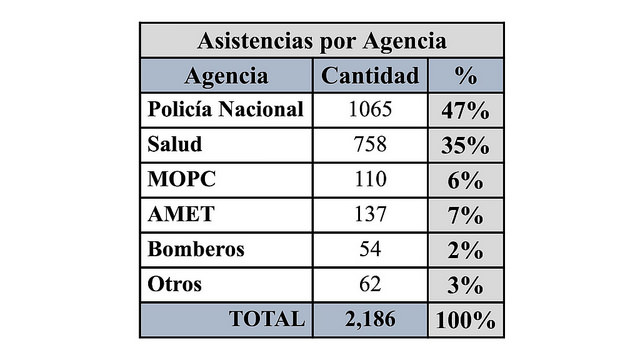 La Policía Nacional concurrió en 1,065 casos, siendo la agencia con mayor número de asistencias, para un 47%; mientras que las unidades de salud apoyaron en 758 casos, lo que representa el 35% del total de las asistencias brindadas.