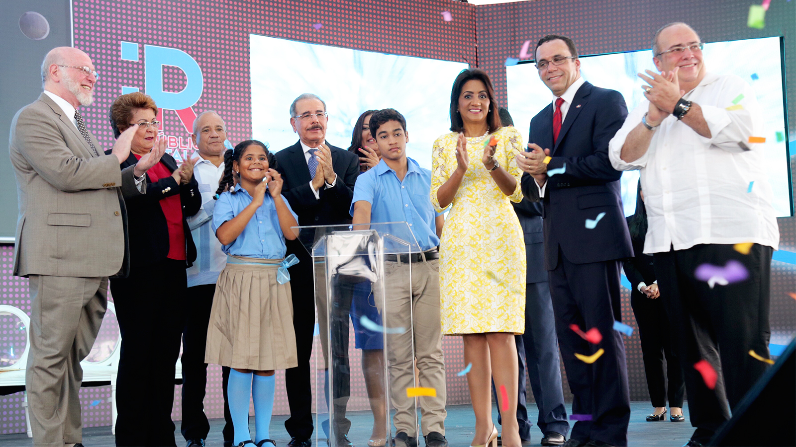 “El presidente Danilo Medina ha revolucionado la enseñanza en la República Dominicana con la inversión sin precedente del 4% del Producto Interno Bruto”. Igualmente, con la Jornada Escolar Extendida que cubre educación, alimentación, uniformes, calzados y útiles didácticos.