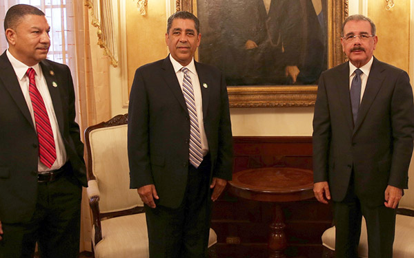 | El senador de Nueva York, Adriano Espaillat y el asambleísta Phil Ramos durante su visita al presidente Medina. |