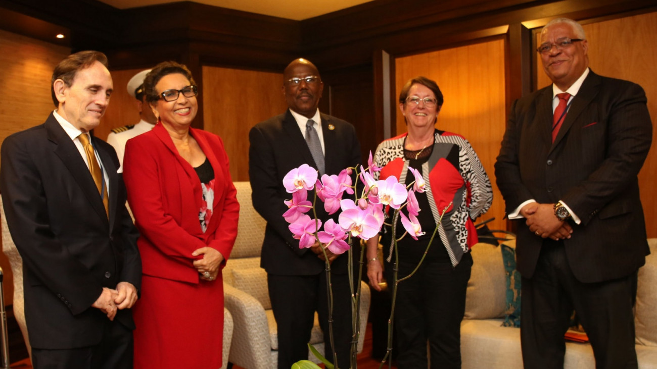 Marlie arribó a la terminal aérea, acompañado del ministro Patrice Gumbs y fue recibido por Sarah Güemez Naut, viceministra de Relaciones Exteriores; José Juan Hernández, embajador encargado de Asuntos de Medio Oriente del Ministerio de Relaciones Exteriores; Ramón Dionisio Ditrén Flores, encargado de la División de Centro América de Relaciones Exteriores y el embajador Pedro Gómez, director de Ceremonial del Estado y Protocolo.